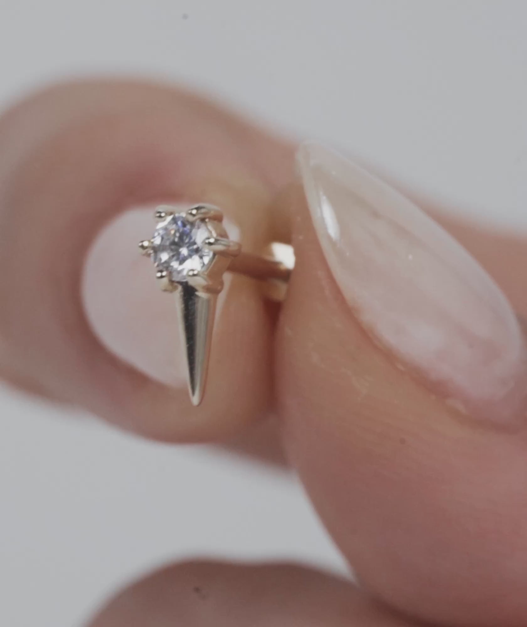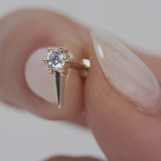 Our Comet flatback stud earring features a round-cut white cubic zirconia gem crowned by a sleek, pointed peak that can be worn in any direction.