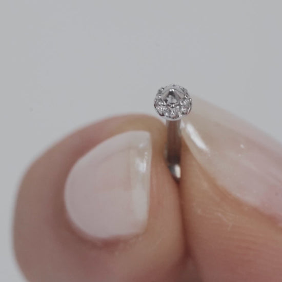 Our Glacier flatback stud earring features a sleek, conical silhouette, bejewelled with round-cut white cubic zirconia gems and milgrain details.