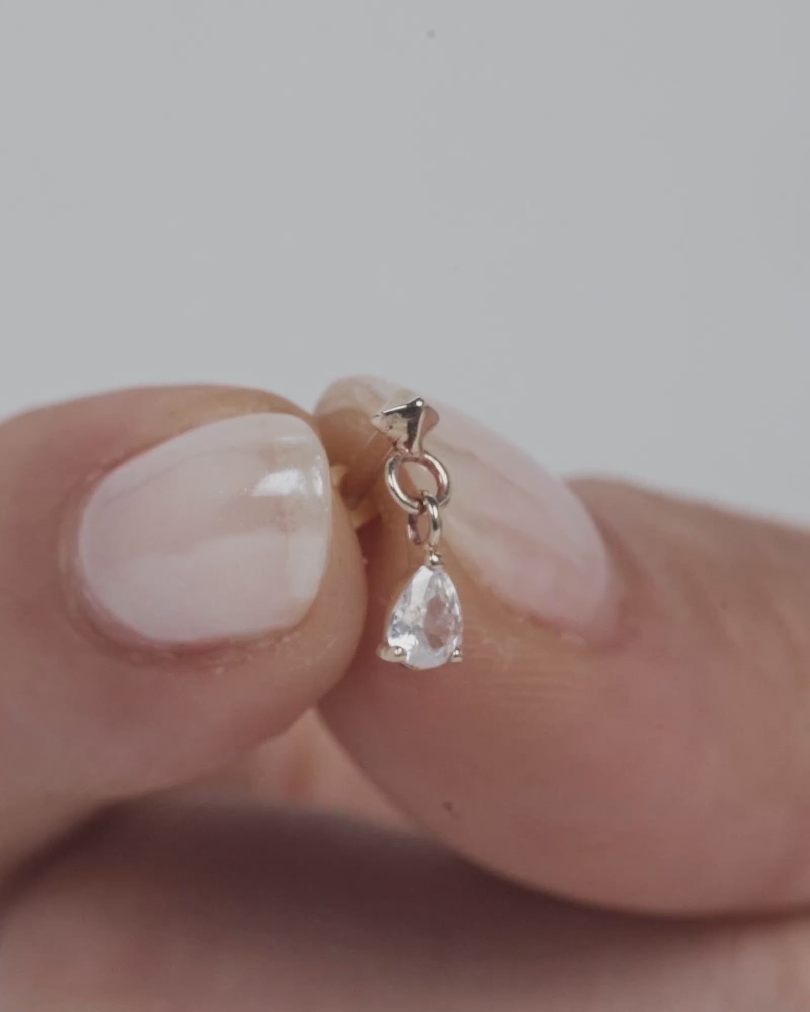 Our Lumi flatback stud earring features a dangling teardrop-cut white cubic zirconia gem suspended from a polished star stud.