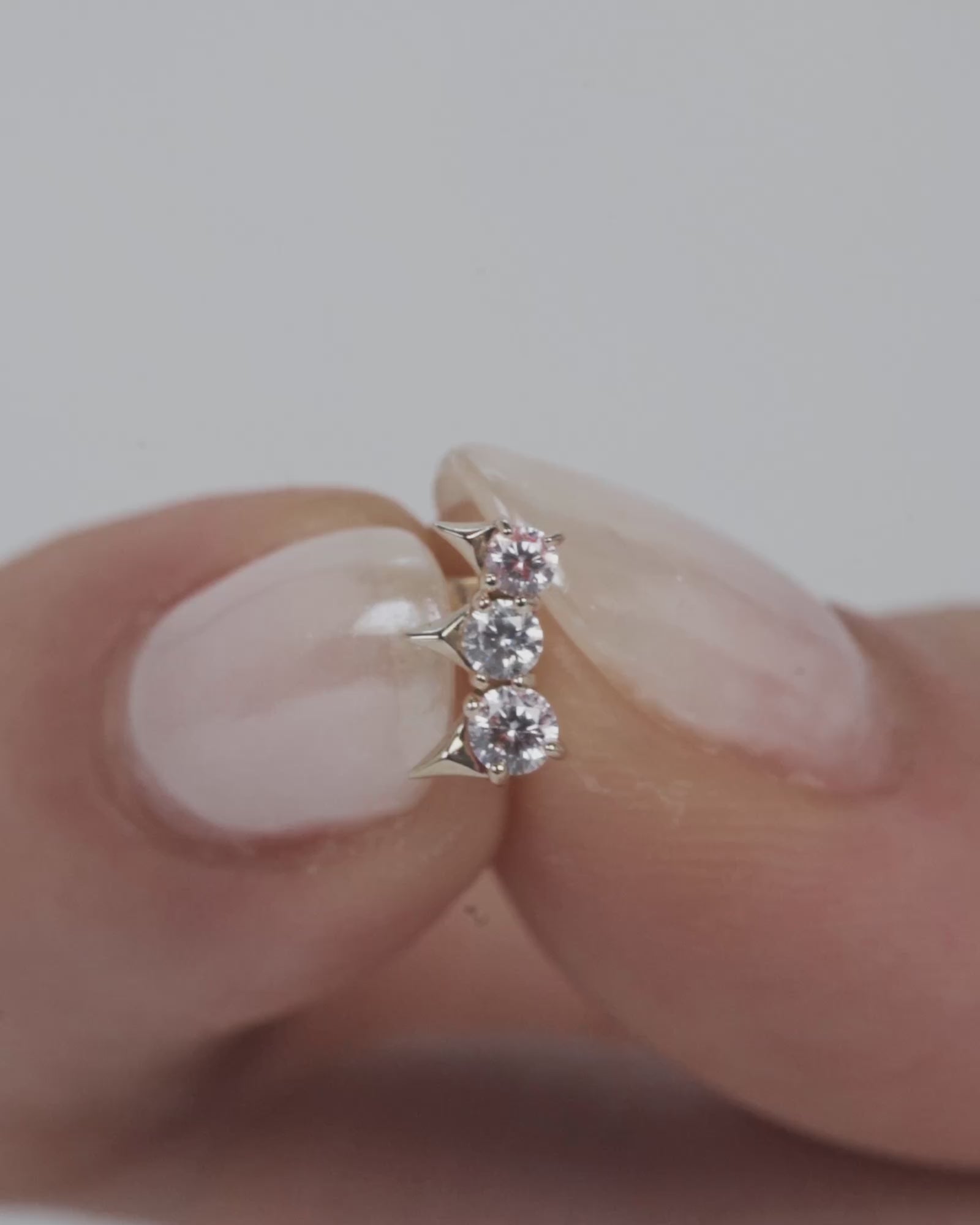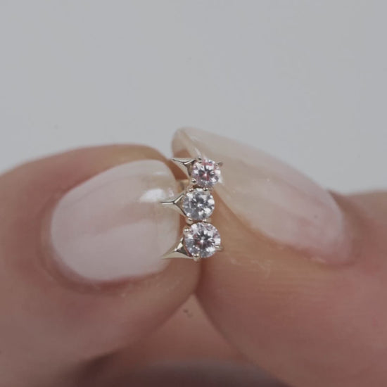 Our Tiara flatback stud earring features a trio of round-cut white cubic zirconia gems, each crowned with a triangular tapered tip.