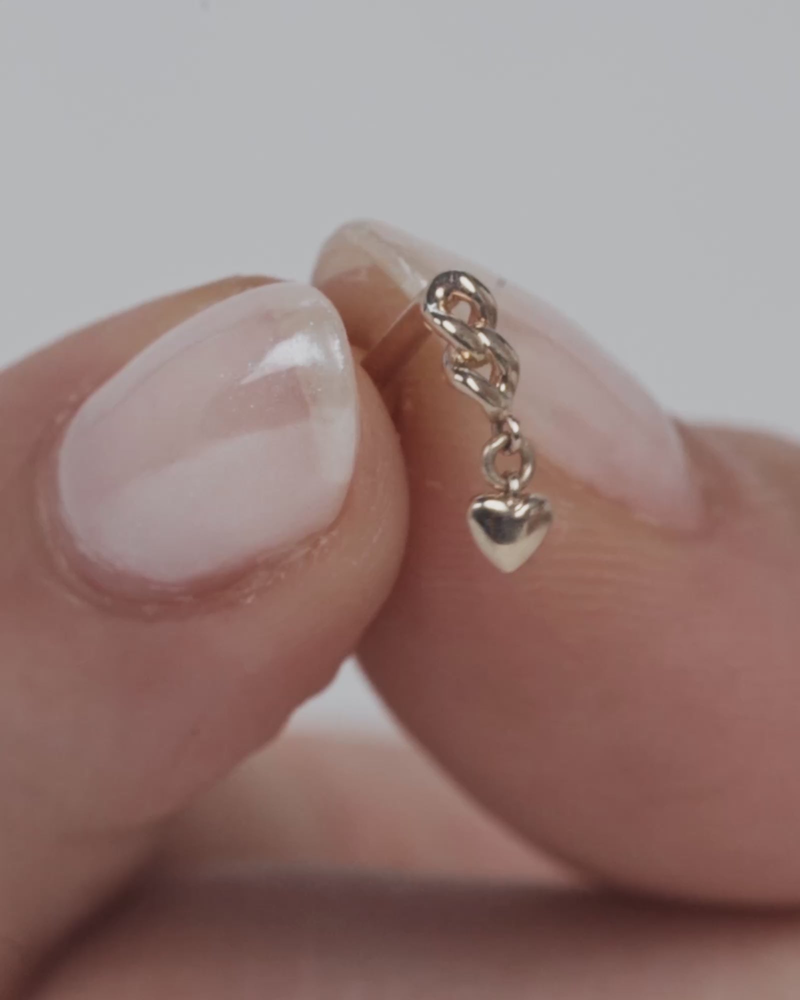 Our Trinket flatback stud earring features a tender heart dangling from a sleek curb chain.